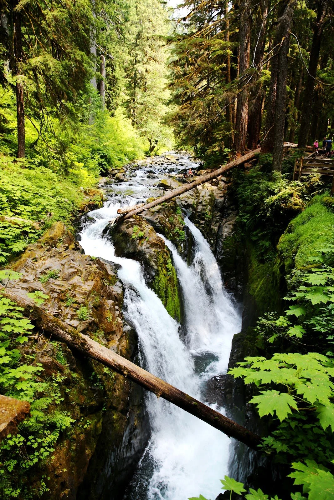 Water cascades down Sol Duc Falls in the Hoh Rainforest in Olympic National Park.