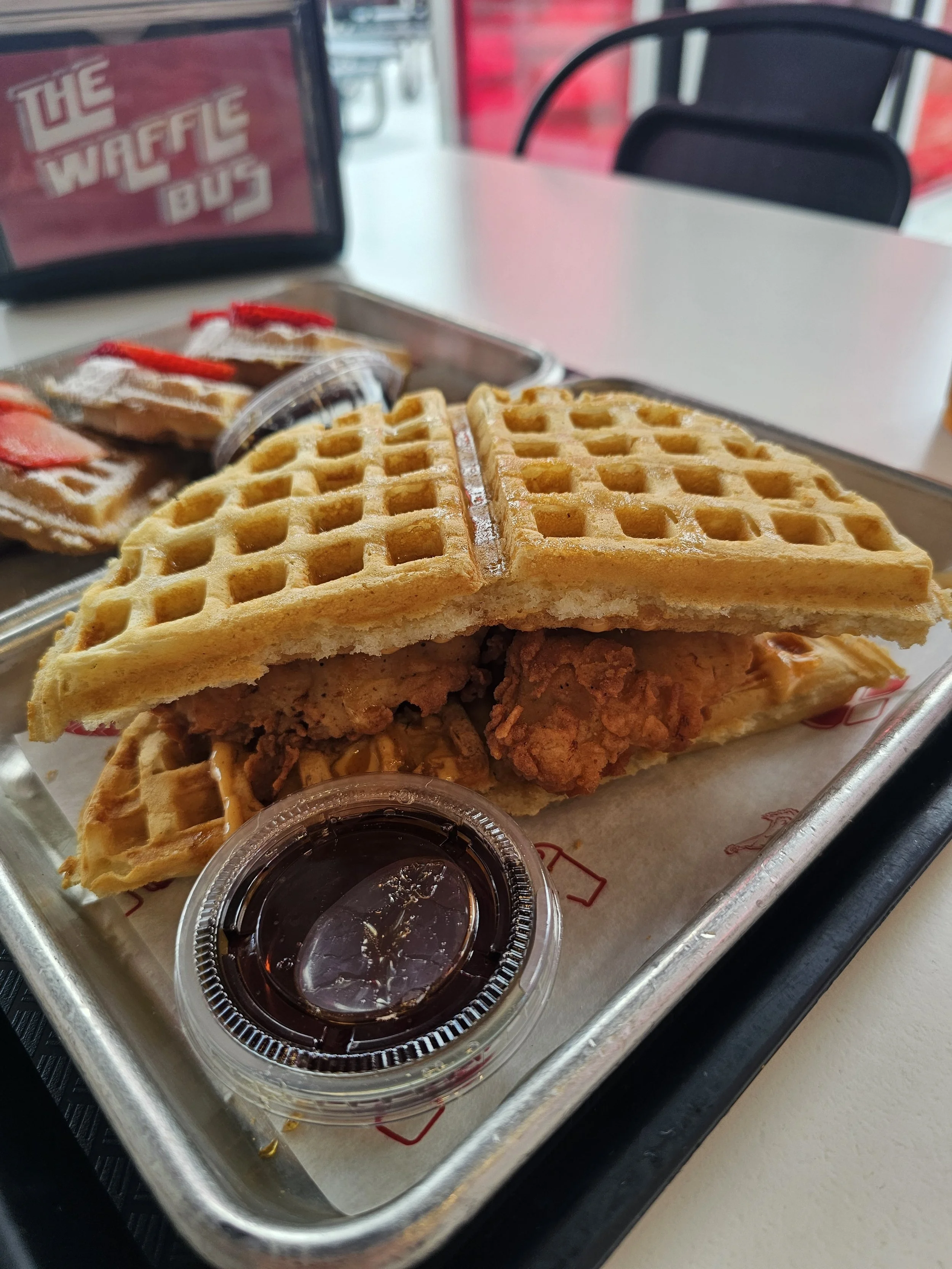 As you can imagine I had high expectations for this restaurant from the start and I am happy to announce that they did not let me down. I love the idea of an entire place dedicated to waffles and was impressed by how many different ways they were able to feature this fantastic breakfast food! Each chicken sandwich had great flavor and the cheeseburger fryders while small, were mighty in flavor as well. The mac and cheese was nice and creamy how I like it and the milkshake tasted exactly like the milk leftover in the bowl after you finish eating all the bits of cereal out. You definitely do get a LOT of food though so either plan to share or expect to be taking home some leftovers. Overall, I enjoyed my trip to The Waffle Bus and I will definitely be going back again!